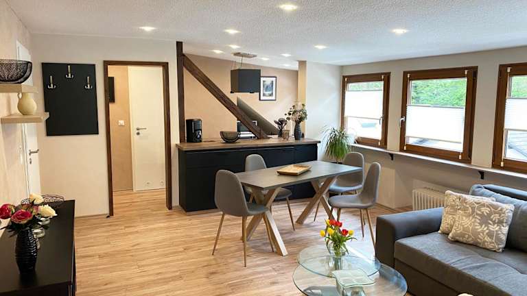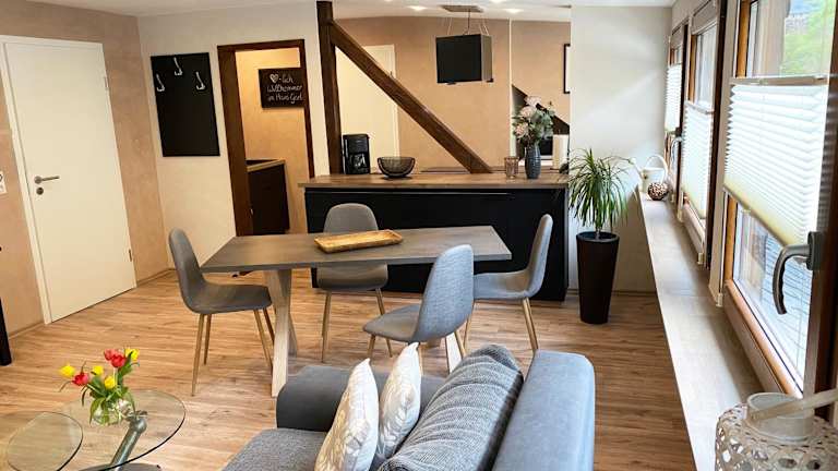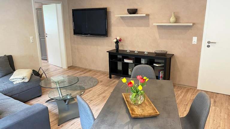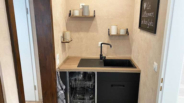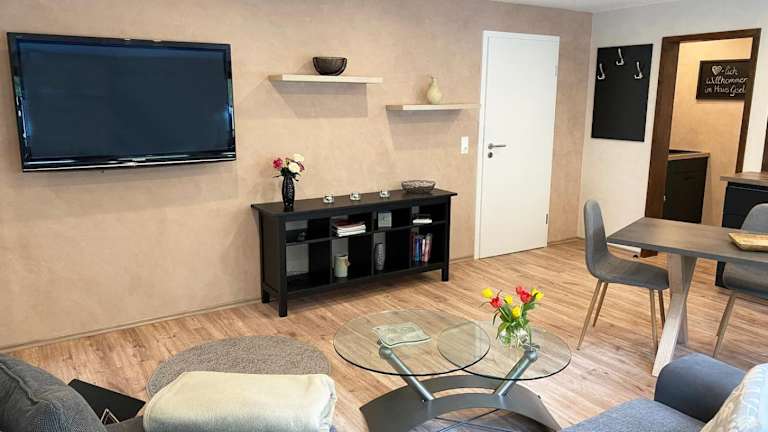 Die Ferienwohnung umfasst ein Schlafzimmer, ein Wohnzimmer sowie eine voll ausgestattete Küche mit Kühlschrank und Kaffeemaschine. Ein Badezimmer mit Dusche und Haartrockner ist ebenfalls vorhanden. Handtücher und Bettwäsche werden bereitgestellt.