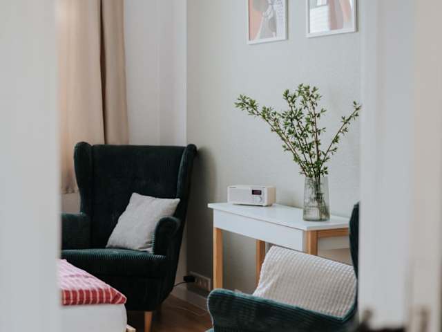 Die Ferienwohnung verfügt über ein Schlafzimmer und ist ausgestattet mit einer Küche, die Kühlschrank und Mikrowelle beinhaltet. Des Weiteren gibt es ein Badezimmer mit Dusche und Haartrockner. Handtücher und Bettwäsche werden bereitgestellt. Die Zimmer sind als Nichtraucherzimmer eingerichtet.