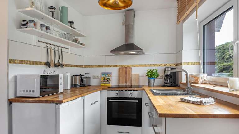 Jede Wohneinheit verfügt über eine voll ausgestattete Küche, die mit einem Kühlschrank, einem Geschirrspüler, einem Ofen, einer Mikrowelle, einer Kaffeemaschine und einem Wasserkocher ausgestattet ist.