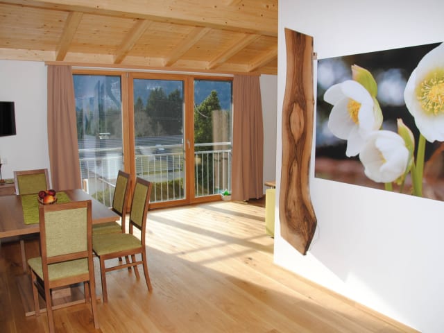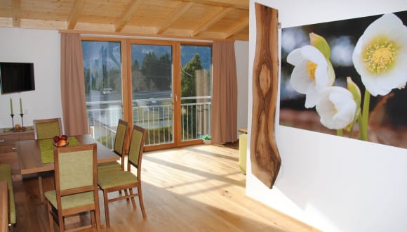 8 gemütliche, stilvoll eingerichtete Apartments für 2 bis 6 Personen. Die größeren **** kategorisierten Apartments bieten nicht nur 2 große Schlafzimmer, sondern auch 2 Bäder und in 3 Apartments (Schneerose, Erika und Kirschblüte) ist sogar eine Infrarotkabine inklusive! Die Wohnräume sind großzügig und hell (zum Teil mit französischen Balkonen) und eingerichtet mit naturnahen Materialien wie Eichendielenparkett, Eichentüren, Dekobrett mit Wandbild und Naturmöbeln in verschiedenen Holzarten - Kernbuche, Eiche und Nuss. Die Küchen sind komplett ausgestattet mit Geschirrspüler inklusive Tabs, Kühlschrank mit Gefrierfunktion, Kaffemaschine, Wasserkocher, Eierkocher, Ceranherd mit vier Kochfeldern und Mikrowelle. In den Bädern stehen für jeden Gast 2 Hand- und Badetücher, Honigseife, Honig-Duschsseifenspender, Föhn, Kosmetikspiegel und Hausslipper bereit.