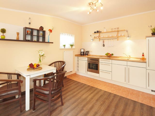 Fernseher, Radio, Küche, Balkon, Terreasse, Badezimmer, Haartrockner, Dusche, WC, Die hell und modern ausgestatteten Ferienwohnungen bieten Schlafgelegenheiten für 2 – 4 Personen. Die Wohnungen bestehen aus Schlaf- und Wohnzimmer sowie Küche, Bad und Flur. Das Schlafzimmer ist gemütlich mit einem Doppelbett und Nachtschränkchen eingerichtet. Im Wohnzimmer können Sie es sich auf einer Couch – die mit Schlaffunktion ausgestattet ist – gemütlich machen. Mit Kabelfernsehen, Radio, CD und DVD-Player bietet Ihnen das Wohnzimmer auch bei schlechtem Wetter genügend Abwechslung. Des Weiteren hält die Küche einen separaten Essplatz für Sie bereit. Im Badezimmer befinden sich die Dusche und WC sowie ein Haartrockner. Platz für Ihre Reisekleidung finden Sie im begehbaren Kleiderschrank im Flur der Wohnung. Sollten die Kleidungsstücke in der Tasche etwas aus der Form geraten sein, bekommen Sie selbstverständlich auch auf Anfrage ein Bügelbrett sowie ein dazugehöriges Bügeleisen. Abgerundet werden die Wohnungen letztlich durch die sonnigen Balkone