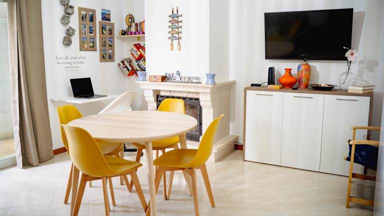 Die Ferienwohnung verfügt über ein Schlafzimmer, ein Wohnzimmer, eine voll ausgestattete Küche mit Kühlschrank und Kaffeemaschine sowie ein Badezimmer mit Bidet und Dusche. Handtücher und Bettwäsche werden bereitgestellt. Eine Sonnenterrasse sowie Gartenmöbel sind ebenfalls vorhanden.