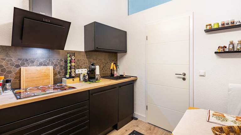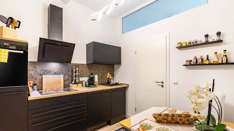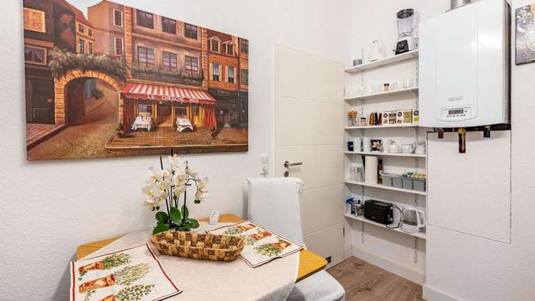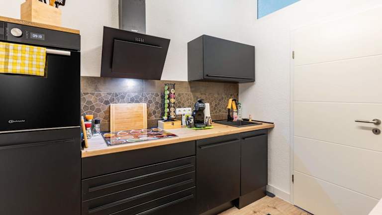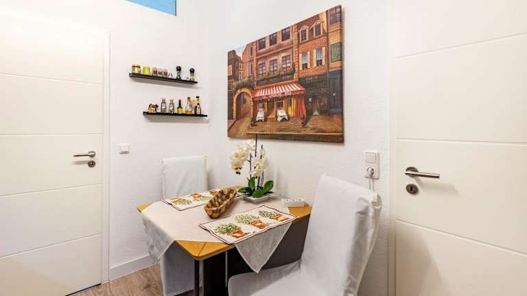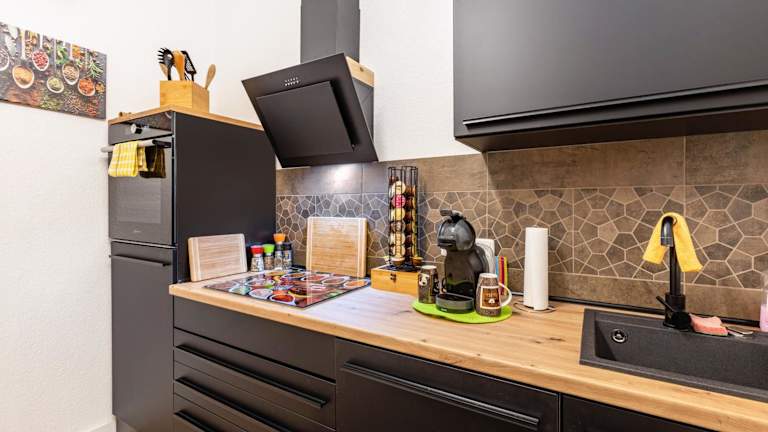 Die Ferienwohnung besteht aus einem Schlafzimmer, einem Wohnzimmer, einer voll ausgestatteten Küche mit Kühlschrank und Kaffeemaschine sowie einem Badezimmer mit Dusche und kostenlosen Pflegeprodukten. Handtücher und Bettwäsche werden bereitgestellt.