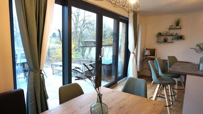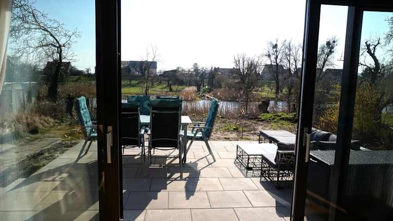 Die FeWo EG am Fluss mit Terrasse ist eine Unterkunft, die sich durch einen Blick auf den Garten auszeichnet. Gäste haben Zugang zu einer Veranda/Patiod, einem Wohnbereich und einer Terrasse mit Flussblick.