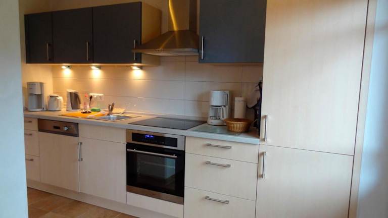 Die Unterkunft besitzt eine Küchenzeile, die mit einem Kühlschrank, einem Geschirrspüler, einem Ofen, einer Kaffeemaschine und einem Wasserkocher ausgestattet ist. Dadurch haben Gäste die Möglichkeit, eigene Mahlzeiten zuzubereiten.