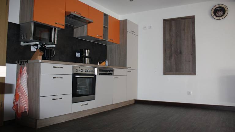 Die Ferienwohnung umfasst ein Schlafzimmer, eine Küche, die mit einem Kühlschrank und einem Geschirrspüler ausgestattet ist, sowie ein Badezimmer mit Dusche, Haartrockner und Waschmaschine.