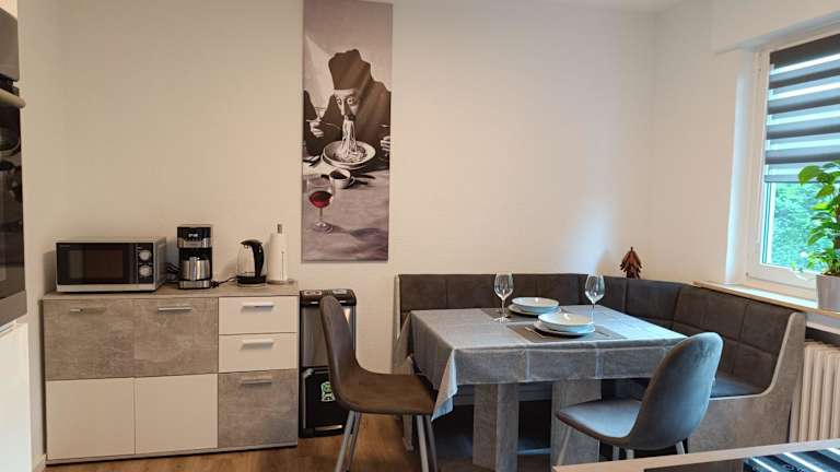 Die voll ausgestattete Küche der Ferienwohnung beinhaltet unter anderem einen Kühlschrank und eine Kaffeemaschine. Handtücher und Bettwäsche sind in der Unterkunft verfügbar.