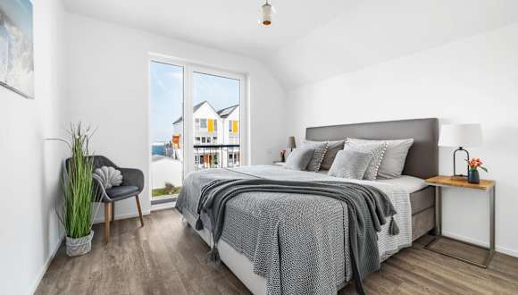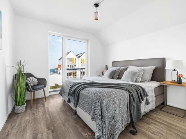 Die Ferienwohnung verfügt über eine voll ausgestattete Küche mit Kühlschrank, Geschirrspüler und Ofen, ein Wohnzimmer mit einem Sitz- und Essbereich, zwei Schlafzimmer sowie ein Badezimmer mit Dusche und Whirlpool. Handtücher und Bettwäsche werden bereitgestellt.