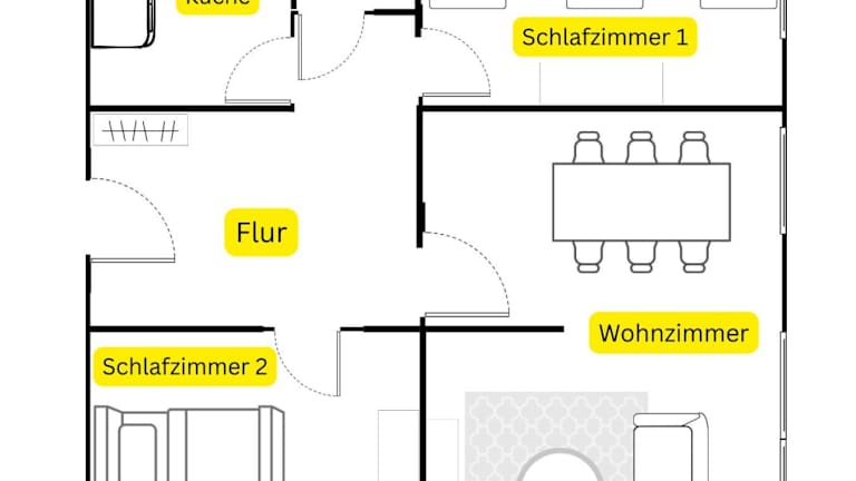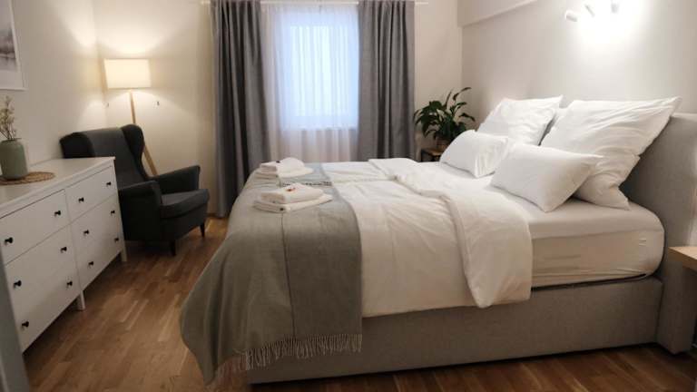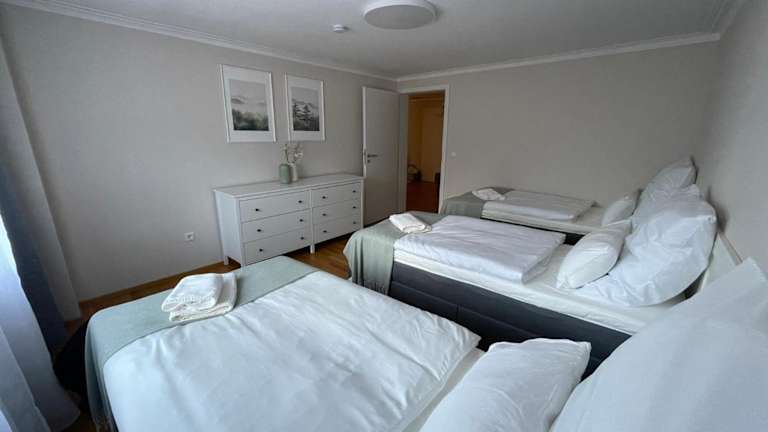 Die Ferienwohnung verfügt über zwei Schlafzimmer, eine voll ausgestattete Küche mit Kühlschrank und Geschirrspüler sowie ein Badezimmer mit Dusche und Haartrockner. Handtücher und Bettwäsche werden bereitgestellt.