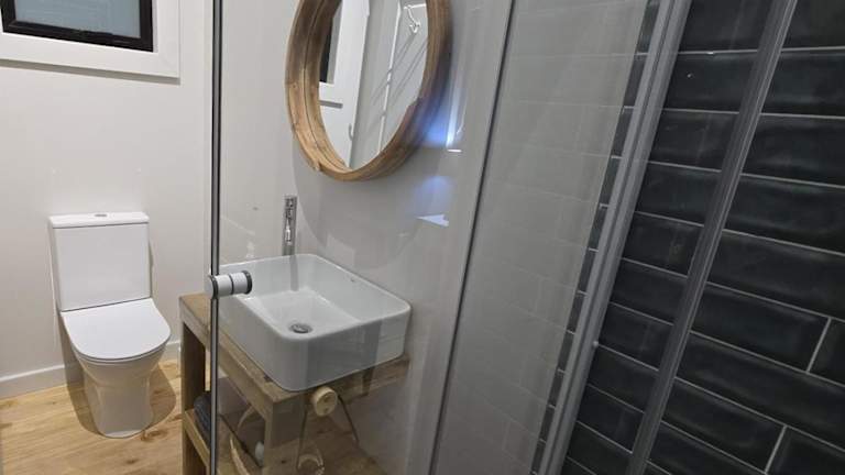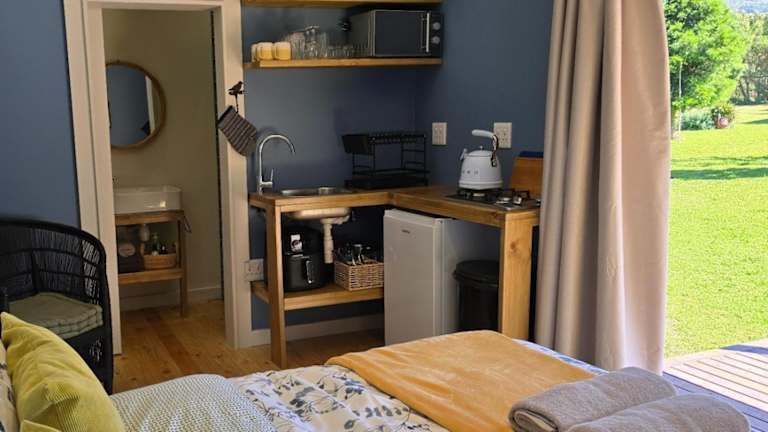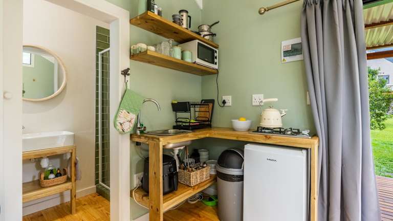Die Chalets im Fijnbosch Cottage and Camping sind offen gestaltet und bieten Platz für bis zu vier Personen. Sie verfügen über ein Hauptschlafzimmer mit einem gemütlichen Doppelbett und einen Wohnbereich mit zwei Einzelbetten. Die Küchenzeile ist mit einer Mikrowelle, einem Kühlschrank, einem kleinen Herd und einem Backofen ausgestattet, so dass Sie Ihre eigenen Mahlzeiten zubereiten können. Kaffee- und Teezubehör ist ebenfalls vorhanden. Die Badezimmer sind mit einer Dusche und kostenfreien Pflegeprodukten ausgestattet.