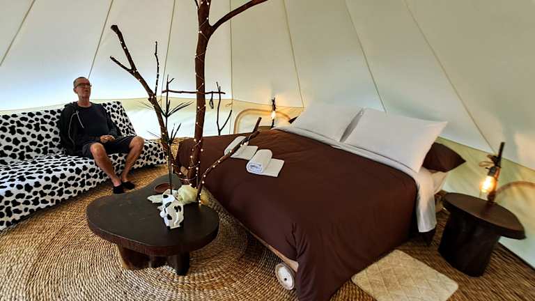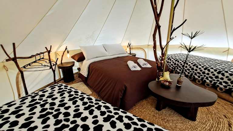 Die Zelte auf der Finca de la Vaca - Glamping & Camping sind komfortabel und bieten eine gemütliche Unterkunft inmitten der Natur. Jedes Zelt verfügt über eine Feuerstelle und ein eigenes Badezimmer mit Dusche.