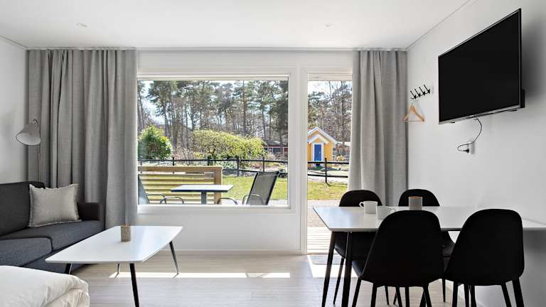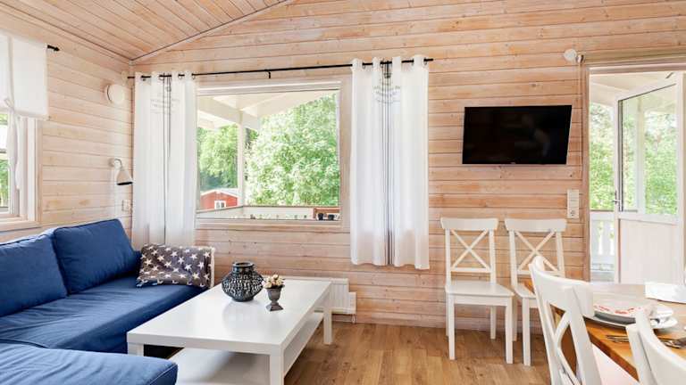 Die Cottages im First Camp Torekov-Båstad sind gemütlich und bieten alles, was Sie für einen angenehmen Aufenthalt benötigen. Jedes Cottage verfügt über eine voll ausgestattete Küche, in der Sie Ihre Mahlzeiten zubereiten können, sowie einen komfortablen Sitzbereich und einen TV. Die Cottages sind von viel Grün umgeben, was eine ruhige und entspannte Atmosphäre schafft.