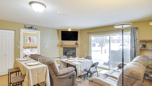 Die First-Floor Big Sky Condo with Hot Tub! ist eine Ferienwohnung mit einem Whirlpool, die Gästen eine entspannende Atmosphäre bietet.