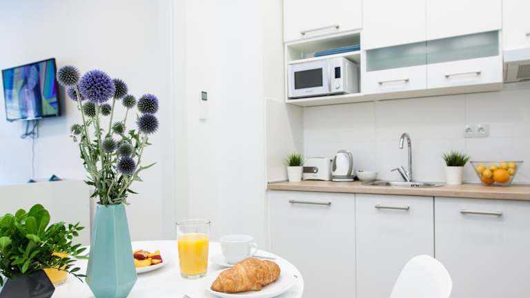 Es stehen in der Unterkunft voll ausgestattete Küchen mit Kühlschrank, Geschirrspüler, Mikrowelle, Wasserkocher und Essbereich zur Verfügung. Es gibt keine spezifischen Informationen zu Verpflegungsmöglichkeiten vor Ort.