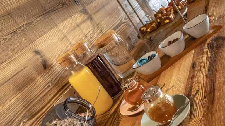 In der Unterkunft wird ein umfangreiches Frühstück in Buffetform angeboten. Es werden diverse Speisen und Getränke zur Verfügung gestellt, darunter auch spezielle Angebote wie Motto-Dinnerabende und Kochkurse gegen Aufpreis.