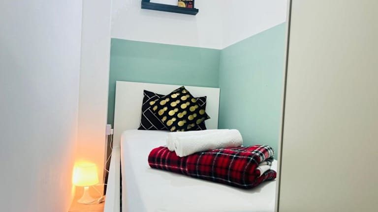 Die Unterkunft umfasst ein Privatzimmer mit einer kleinen Abtrennung, in dem Handtücher und Bettwäsche bereitgestellt werden.