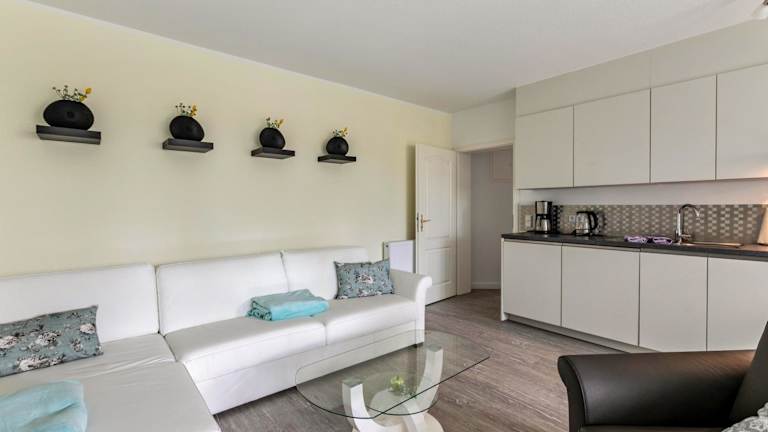 Die Ferienwohnung besteht aus einem Schlafzimmer, einem Wohnzimmer und einer voll ausgestatteten Küche, die mit einem Kühlschrank und einer Kaffeemaschine ausgestattet ist. Ein Badezimmer mit Dusche und Haartrockner steht ebenfalls zur Verfügung.