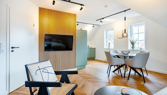 Die Ferienwohnung umfasst zwei Schlafzimmer, ein Wohnzimmer sowie eine voll ausgestattete Küchenzeile mit Kühlschrank und Kaffeemaschine. Zudem steht ein Badezimmer mit Dusche und Haartrockner zur Verfügung. Handtücher und Bettwäsche werden bereitgestellt.