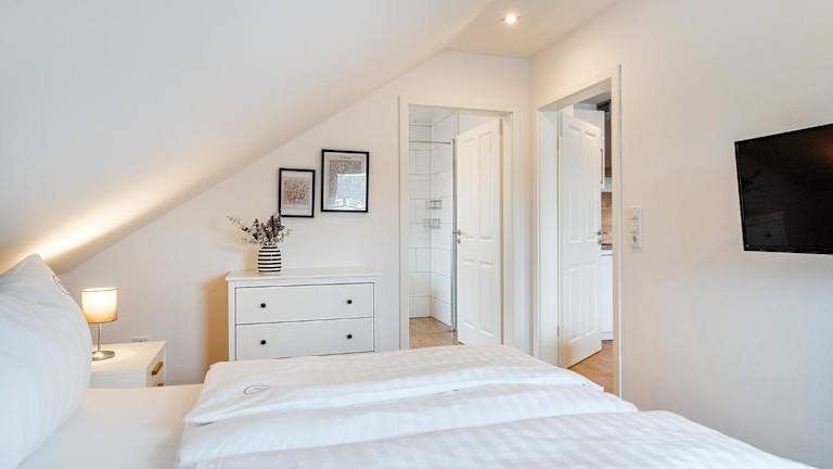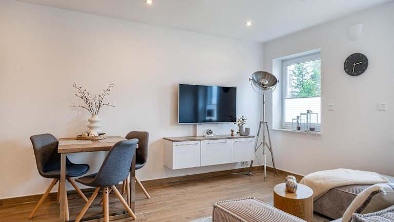 Die Ferienwohnung verfügt über ein Schlafzimmer, ein Wohnzimmer und eine vollständig ausgestattete Küchenzeile mit Kühlschrank und Kaffeemaschine. Das Badezimmer ist mit einer Dusche und einem Haartrockner ausgestattet. Handtücher und Bettwäsche werden bereitgestellt.