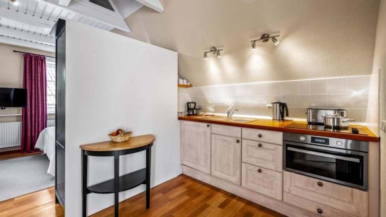 Das Apartment im Fuchsbau - Kirchtwiete 4b verfügt über einen gemütlichen Wohnbereich mit einem TV und eine voll ausgestattete Küchenzeile. Hier finden Sie einen Kühlschrank, eine Mikrowelle, ein Kochfeld, eine Kaffeemaschine und einen Wasserkocher. Das kostenfreie WLAN sorgt dafür, dass Sie immer mit der Welt verbunden bleiben.