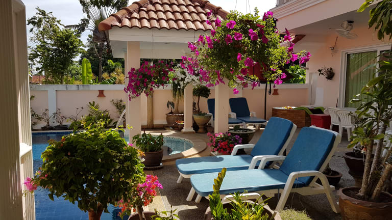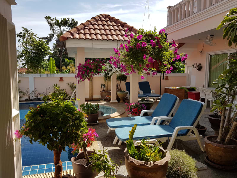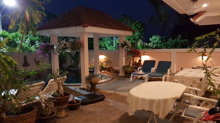 Wenn Sie Ihren Notebook (mit WLAN-Adapter) mitbringen können Sie kostenlos unser Internet benutzen. Als besondere Merkmale unseres Hauses bieten wir unseren Gästen auf Anfrage: unseren persönlichen Flughafentransfer, Wäscheservice, Kinderbetreuung, Thai-Kochkurse. Badetücher für den Strand können Sie bei uns gegen eine geringe Gebühr ausleihen! Swimming-Pool abends Desweiteren haben wir sehr gute Beziehungen zu Fahrzeugvermietungen, Ausflugsveranstaltern, Spa und Wellnessanlagen und können Ihnen deshalb außerordentlich günstige Preise in diesen Bereichen anbieten. Bevor Sie persönlich, oder direkt über das Internet, bei irgendeinem Reiseveranstalter etwas vorab buchen sollten Sie zuerst mit uns sprechen. Wir sprechen Deutsch, Englisch und Thai. Nutzen Sie bitte unsere jahrelange Erfahrung in Thailand.