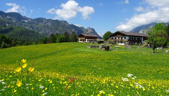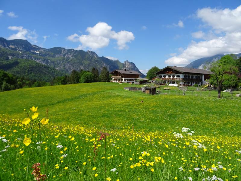 unser Gästehaus liegt inmitten von eigenen Wiesen auf einer sonnigen Anhöhe mit Blick auf die Berchtesgadener Bergwelt.