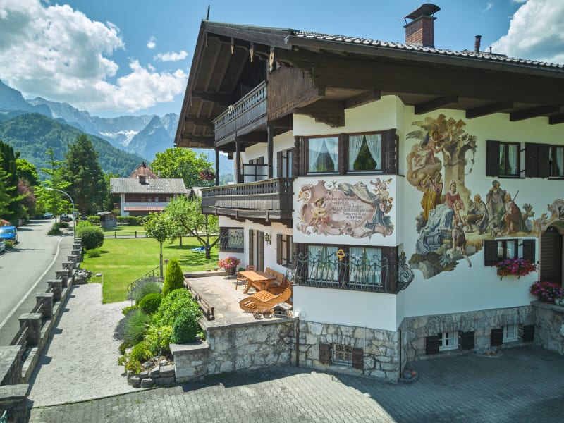 Gut wohnen in einem schönen Haus, gepflegtes und geschmackvoll eingerichtetes Gästehaus im Ortsteil Partenkirchen. Das schmucke, bayerische Landhaus wurde wegen seiner schönen Fassadenmalerei unter Denkmalschutz gestellt. Familienbetrieb, 24 Betten, umgeben von einer großen Gartenanlage mit Liegewiese.