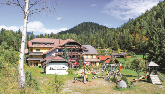 Schon der freundliche Empfang im Hotel Gasthof Gailberghöhe lässt erahnen, wie Sie diesen Urlaub genießen werden. Und der erste Blick ins Zimmer zeigt Ihnen, dass Sie Ihr Urlaubsdomizil richtig gewählt haben - geräumig, mit Naturholzmöbeln eingerichtet, Bad, Dusche, WC, Telefon und SAT-TV. Nach einer erholsamen Nacht erwartet Sie ein Frühstücksbuffet mit verschiedenen Schmankerln, entweder auf der sonnigen Terrasse im Freien oder im Frühstücksraum mit herrlichem Ausblick. Unsere Küche verwöhnt Sie mit heimischen Köstlichkeiten aus der Region und dazu servieren wir gerne ausgesuchte Weine aus unserem Weinkeller. Und sollten Sie einen speziellen Wunsch haben, wird dieser nach Möglichkeit gerne erfüllt. Die Kinder toben noch auf unserem Abenteuerspielplatz ausgelassen herum, während Sie auf der Terrasse die letzten Sonnenstrahlen genießen. Im Winter werden Sie auf unserer nachts beleuchteten Rodelbahn mächtig Spaß haben. Die Trockenstube dient anschließend zum Aufbewahren der Skikleidung. In unserer Stube können Sie am knisternden Kamin bei wohliger Wärme und einem Schlummertrunk entspannen und den Abend ausklingen lassen. So können Sie richtig genießen - nicht nur Urlauber sein, sondern Hausgast - bei Familie Buzzi. Das Hotel Gasthof Gailberghöhe ist auch ideal gelegen für Wanderungen, Mountainbiking, Jogging, Klettern oder Motorradtouren. Unsere Wasser- und Wellnessoase Aquarena Kötschach-Mauthen mit Freibad und Hallenbad befindet sich ca. 5 km vom Hotel entfernt. Das Familienskigebiet Kötschach-Mauthen erreichen Sie vom Hotel aus in etwa 10 Autominuten. Kinder bis 9,99 Jahre fahren im Familienskigebiet Kötschach-Mauthen in der Nebensaison gratis Ski - ab einem Aufenthalt von 3 Nächten. Motorrad-Fans freuen sich über unsere Trockenstube und die Motorrad-Klinik mit Hebebühne. Abholservice und ausgearbeitete Bikertouren stehen zur Verfügung.