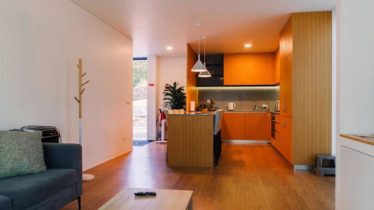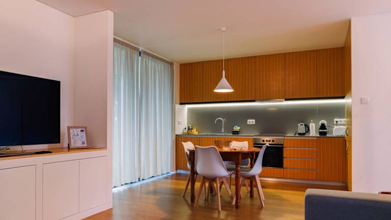 Die Wohneinheiten verfügen über eine voll ausgestattete Küche, die mit einem Kühlschrank, Geschirrspüler, Ofen, Kaffeemaschine und Wasserkocher ausgestattet ist. Zudem gibt es einen Esstisch in jeder Einheit.