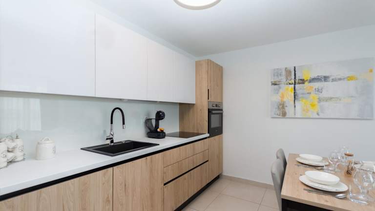 Die Wohnung verfügt über ein Schlafzimmer, ein Wohnzimmer, eine voll ausgestattete Küche mit Kühlschrank und Kaffeemaschine sowie ein Badezimmer mit Dusche. Handtücher und Bettwäsche werden bereitgestellt.