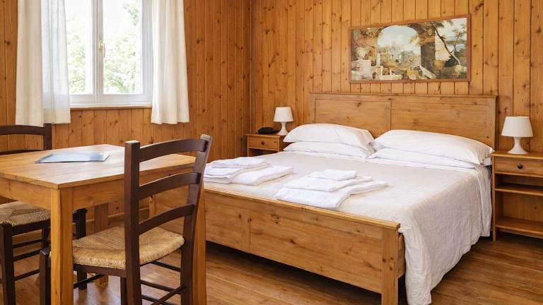 Zimmer im Garden Village San Marino – Komfortabel & Ruhig Unsere Zimmer im Garden Village San Marino bieten Ihnen erholsamen Urlaub inmitten der Natur. Ideal für Paare oder kleine Familien, die Ruhe, Entspannung und einen gemütlichen Rückzugsort suchen. Ausstattung der Zimmer: Doppel- oder Einzelbetten für erholsame Nächte, eigenes Bad mit Dusche und Terrasse mit Blick ins Grüne. Hinweis: Die Zimmer verfügen nicht über eine Küchenzeile, sind jedoch perfekt für Gäste, die Entspannung und Komfort in der Natur suchen. Chalets im Garden Village San Marino – Privatsphäre & Selbstversorgung Die Chalets bieten großzügigen Platz, Komfort und Privatsphäre – perfekt für Familienurlaub, Gruppen oder längere Aufenthalte in der Natur. Dank der voll ausgestatteten Küchenzeile können Sie flexibel kochen und Ihren Aufenthalt selbst gestalten. Ausstattung der Chalets: Voll ausgestattete Küchenzeile für Selbstversorgung, eigenes Bad mit Dusche und Terrasse oder privater Gartenbereich zum Entspannen