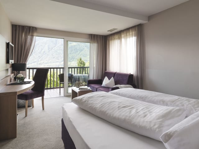 Die einmalige Lage an den sonnigen Hängen des Küchelberges bietet Ihnen die schönste Aussicht auf Meran und die umliegende Bergwelt. Uneingeschränkt können Sie ihren Blick von der Terrasse, der Liegewiese oder Ihrem Zimmer über dieses einmalige Panorama schweifen lassen.