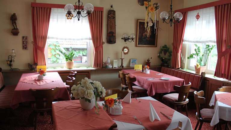 Im rustikalen, holzvertäfelten Restaurant des Gasthofs Jäger wird Ihnen jeden Morgen ein reichhaltiges Frühstücksbuffet serviert. Hier können Sie eine große Auswahl an Lebensmitteln aus der Region Hessen genießen und gestärkt in den Tag starten. Das Restaurant bietet auch ein gemütliches Ambiente für ein Abendessen im Landhausstil.