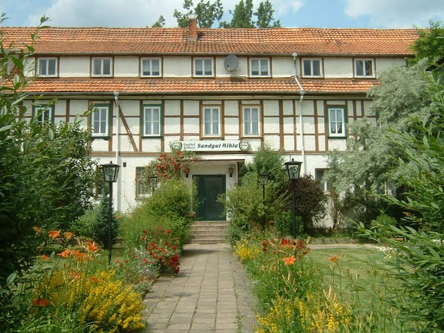In landschaftlich schöner Umgebung, direkt an der Werra, befindet sich das Sandgut Mihla, nördlich von Eisenach am Rande des Nationalparkes Hainich. Bis zum 16. Jahrhundert als Pfarrort Münsterkirchen bekannt, wurde die Wüstung von den Herren von Harstall als Vorwerk erbaut, wobei der Name "Sandgut" aufkam. Das Sandgut wurde nach 1945 als Lehrlingswohnheim der früheren LPG genutzt und ist auch heute noch dem landwirtschaftlichen Betrieb angegliedert. Unser Hotel befindet sich am nördlichen Werrabogen, unmittelbar am Werratalradweg. Aufgrund der ruhigen Lage unserer Gästezimmer können Sie bei uns erholsam übernachten. Am Morgen erwartet Sie ein reichhaltiges leckeres Frühstück.
