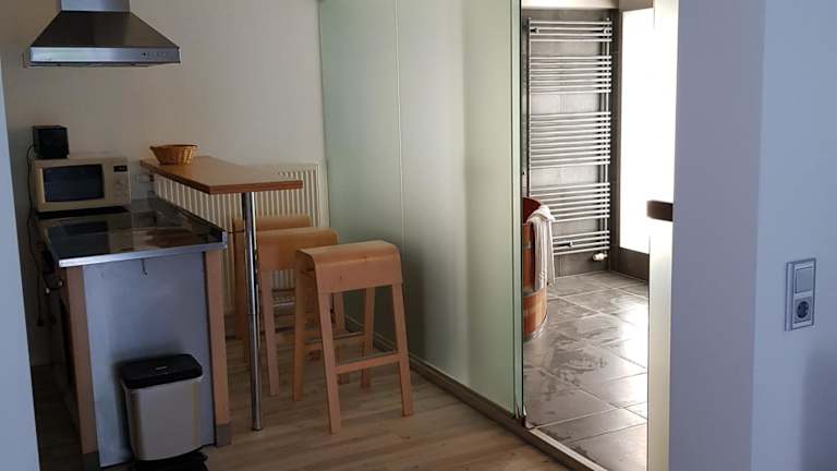 Die Unterkunft umfasst ein Schlafzimmer sowie eine Küche, die mit einem Kühlschrank, einem Ofen und einer Kaffeemaschine ausgestattet ist. Handtücher und Bettwäsche sind in der Ferienwohnung vorhanden.