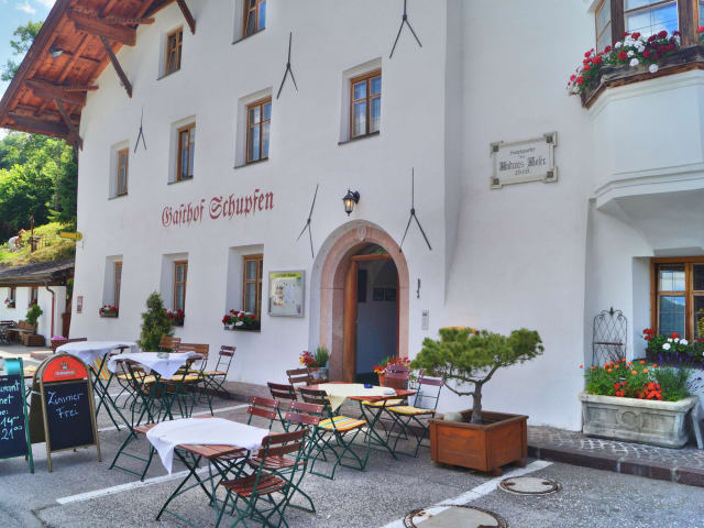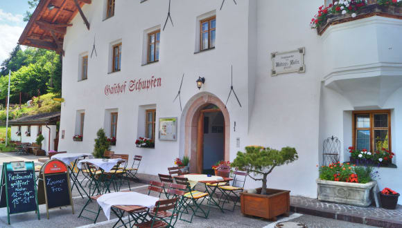 Das kleine, gemütliche und familiengeführte Gasthof zum Schupfen im traditionellen alpenländischen Stil aus dem Jahr 1400 genießt eine grüne Lage mit wunderbaren Blick auf die Berge. Vor allem Individualreisende zum empfehlen und nur 10 Fahrminuten vom Zentrum von Innsbruck entfernt. Die Zimmer sind geräumig, komfortabel mit zeitgenössischen hellen Holzmöbeln, Bergblick und einen Flachbild SAT-TV ausgestattet. In allen Zimmern erwartet Sie kostenloses Internet. Morgens steht ein süßes und herzhaftes Frühstücksbuffet für Sie bereit, zu dem unter anderem Aufschnitt, Käse, Kuchen und Marmeladen gehören. Bei schönem Wetter können Sie das Frühstück auf der Terrasse einnehmen. Freuen Sie sich zudem auf ein gemütliches Restaurant mit Garten, einen Kamin und einer Bar. Für Ihr leibliches Wohl sorgt das hauseigene Restaurant, das vom Restaurantführer Slow Food 2013 ausgezeichnet wurde. Lokale Spezialitäten und internationale Köstlichkeiten aus regionalen und saisonalen Produkten zu einem fairen Preis werden serviert. 1809 war es das Hauptquatier Andreas Hofers wärend der Bergisel-Schlachten. Sein Zimmer ist als Museum zu besichtigen. Das historische Gebäude wurde unter Denkmalschutz gestellt. Die bergige Umgebung erkunden Sie am besten bei einer schönen Wanderung oder einer Radtour. Im Winter erreichen Sie die umliegenden Schigebiete in 10 – 20 min. Die Parkplätze nutzen Sie ohne Gebühr. Direkt vor dem Hotel befindet sich eine Bushaltestellte mit direkten Verbindungen nach Innsbruck-Zentrum. Lassen Sie sich überraschen und verwöhnen im Gasthof zum Schupfen - wir freuen uns auf Ihren Besuch!