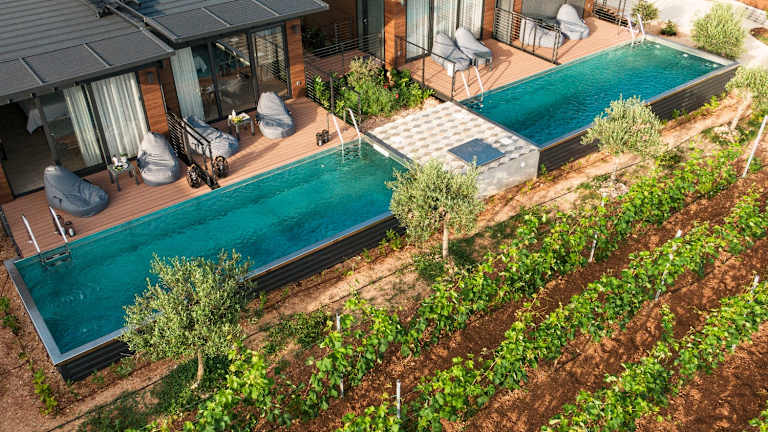 Forest Cottage (34 m²): Schlafzimmer mit Doppelbett (180 x 200 cm), separates Wohnzimmer mit zwei Zusatzbetten (je 190 x 80 cm), 8 m² große Außenterrasse. Vineyard Cottage with individual plunge pool (24 m²): Schlafzimmer mit Doppelbett (180 x 200 cm), 6 m² große Außenterrasse, privates Tauchbecken. Vineyard Cottage with shared pool (24 m²): Schlafzimmer mit Doppelbett (180 x 200 cm), 6 m² große Außenterrasse, 1,4 m tiefer privater Außenpool, der von zwei Einheiten gemeinsam genutzt wird. Die Cottages befinden sich im Gava Waterman Milna All-Inclusive-Resort. Gäste mit All-Inclusive-Buchung können das gesamte Gava-All-Inclusive-Angebot nutzen.