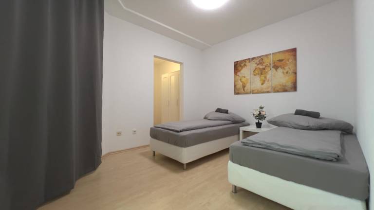 Die Wohnung ist für bis zu fünf Personen ausgelegt und besteht aus zwei Schlafzimmern. Sie ist mit einer voll ausgestatteten Küche sowie einem Balkon ausgestattet.