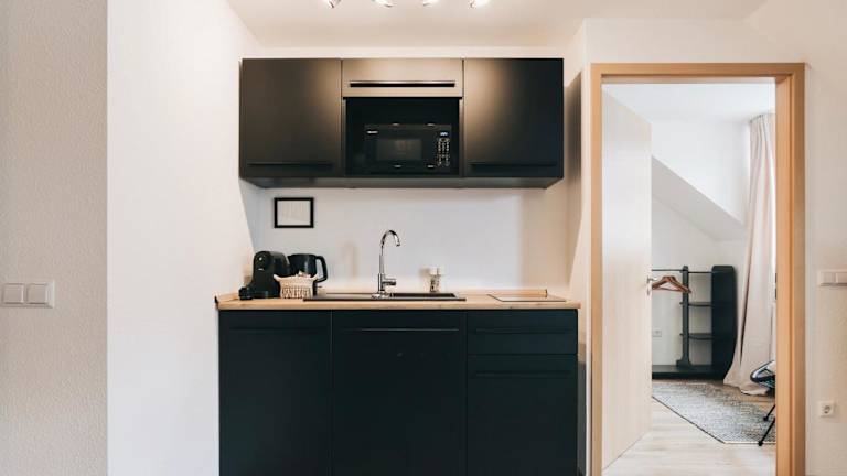Die Ferienwohnung umfasst eine voll ausgestattete Küche mit einem Kühlschrank und einer Kaffeemaschine, um die Selbstverpflegung zu erleichtern.