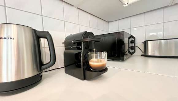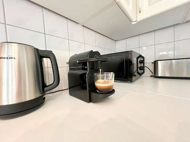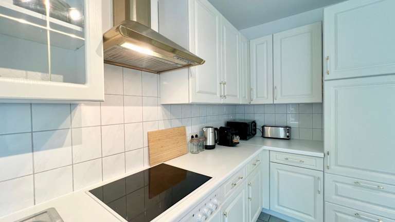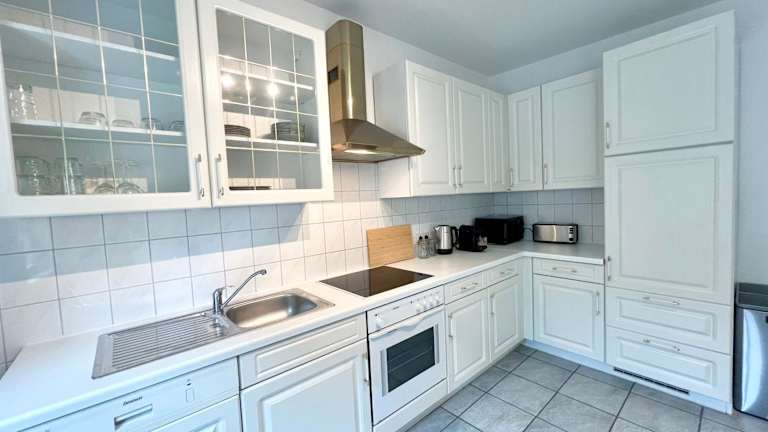 In der Unterkunft steht eine gut ausgestattete Küche zur Verfügung, die über einen Kühlschrank, einen Geschirrspüler, einen Ofen sowie eine Kaffeemaschine verfügt.