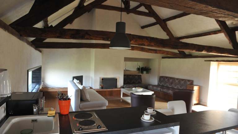 Jede Wohneinheit ist mit einer vollständig ausgestatteten Küchenzeile ausgestattet, die einen Kühlschrank, einen Ofen, eine Herdplatte sowie eine Kaffeemaschine und einen Wasserkocher enthält. Ein Esstisch ist ebenfalls vorhanden.