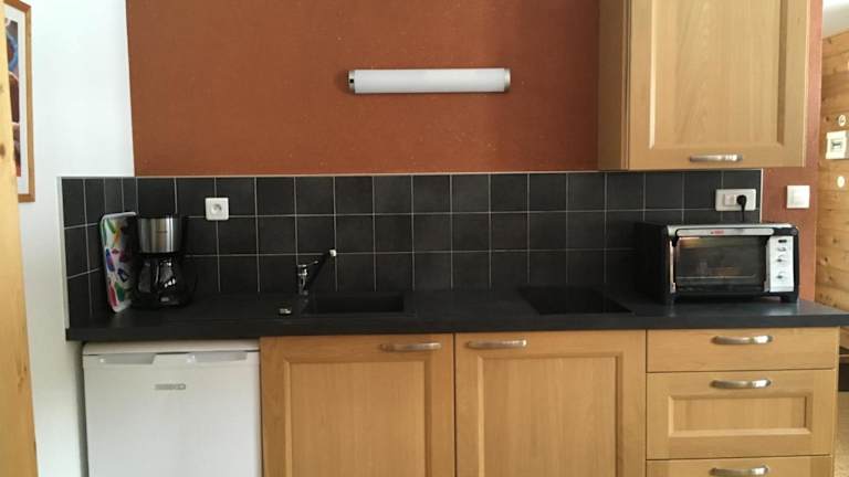 Die Ferienwohnung umfasst ein Schlafzimmer, ein Wohnzimmer und eine voll ausgestattete Küche mit Kühlschrank und Kaffeemaschine. Ein Badezimmer mit Dusche und Haartrockner ist ebenfalls vorhanden. Handtücher und Bettwäsche werden bereitgestellt.