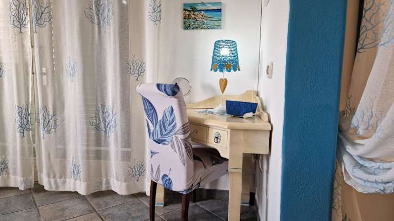 Die klimatisierten Zimmer sind ausgestattet mit einem Schreibtisch, einer Kaffeemaschine, einem Kühlschrank, einem Toaster, einem Safe, einem Flachbild-TV sowie einem eigenen Badezimmer mit Bidet. Jedes Zimmer verfügt über eine Veranda/Patio und ist mit Bettwäsche und Handtüchern ausgestattet.