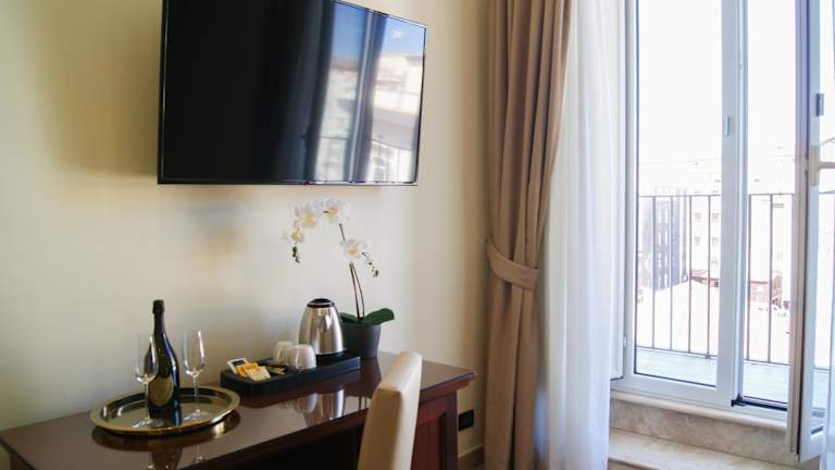 Die Zimmer im Glam Luxury Rome sind ausgestattet mit einem Schreibtisch, einem Flachbild-TV und einem eigenen Badezimmer. Bettwäsche und Handtücher werden bereitgestellt. Jedes Zimmer verfügt über einen Safe, während einige Zimmer zusätzlich mit einem Balkon und Stadtblick ausgestattet sind. Alle Wohneinheiten bieten einen Kleiderschrank und einen Wasserkocher.