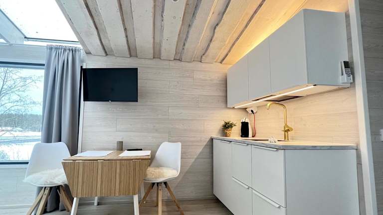 Die klimatisierten Glass Igloos by the water - Lasisviit bieten eine einzigartige Unterkunftsmöglichkeit. Die Glasiglus sind direkt am Wasser gelegen und bieten einen atemberaubenden Blick auf den Fluss. Jedes Ferienhaus verfügt über ein Schlafzimmer, ein Badezimmer, einen Flachbild-TV, einen Essbereich, eine voll ausgestattete Küchenzeile und eine Terrasse mit Flussblick. Bettwäsche und Handtücher werden gestellt. Kostenfreies WLAN und Privatparkplätze stehen den Gästen zur Verfügung.