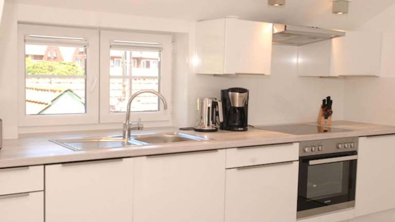 Die Ferienwohnung umfasst zwei Schlafzimmer, ein Wohnzimmer sowie eine gut ausgestattete Küchenzeile, die mit einem Kühlschrank und einem Geschirrspüler versehen ist. Ein Balkon steht ebenfalls zur Verfügung. Handtücher und Bettwäsche werden bereitgestellt.