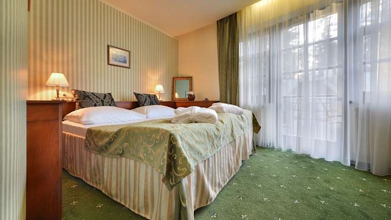 Das Hotel Morris Relax & Wellness befindet sich in Marienbad, einem renommierten Kurort in Westböhmen. Es liegt gegenüber dem Royal Golf Club und bietet eine ideale Lage für Gäste, die die Schönheit der Umgebung erkunden möchten. In der Nähe befindet sich auch das Naturschutzgebiet Kladska Torf, das sich perfekt für Ausflüge eignet. Die bergige Umgebung ist im Sommer ideal zum Radfahren, Wandern und Reiten. Im Winter können Sie die nahegelegenen Skipisten des Skigebiets Marienbad erkunden.