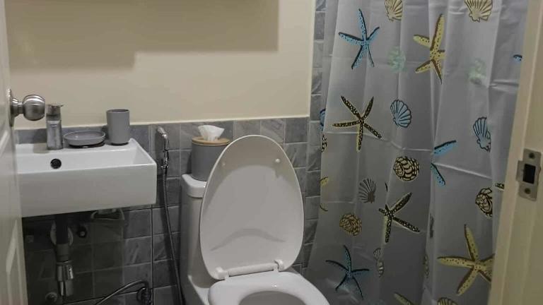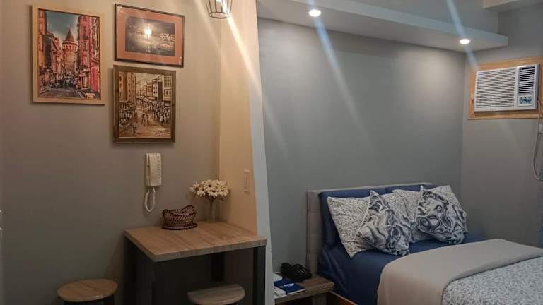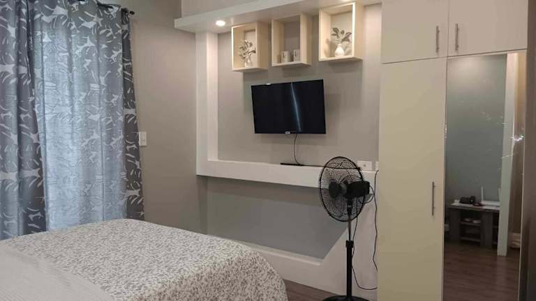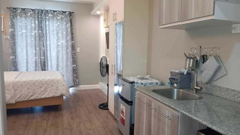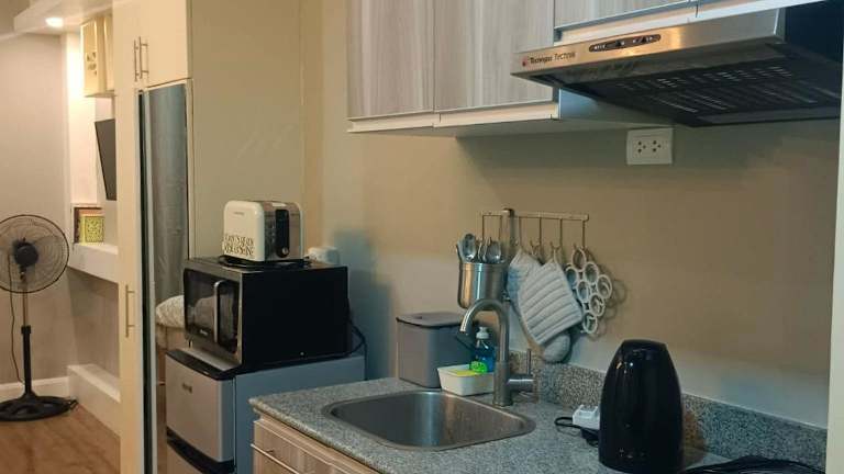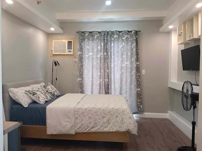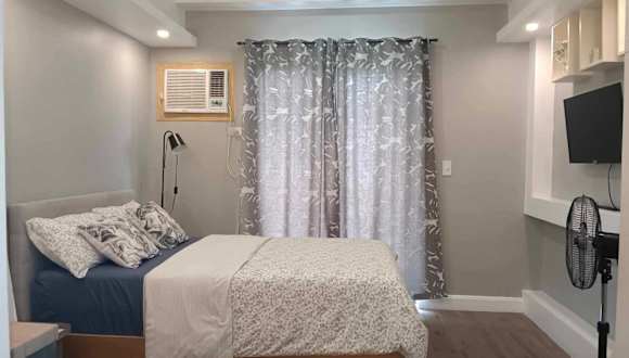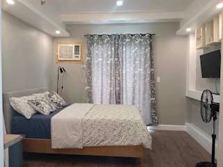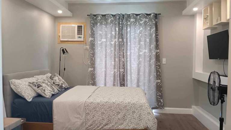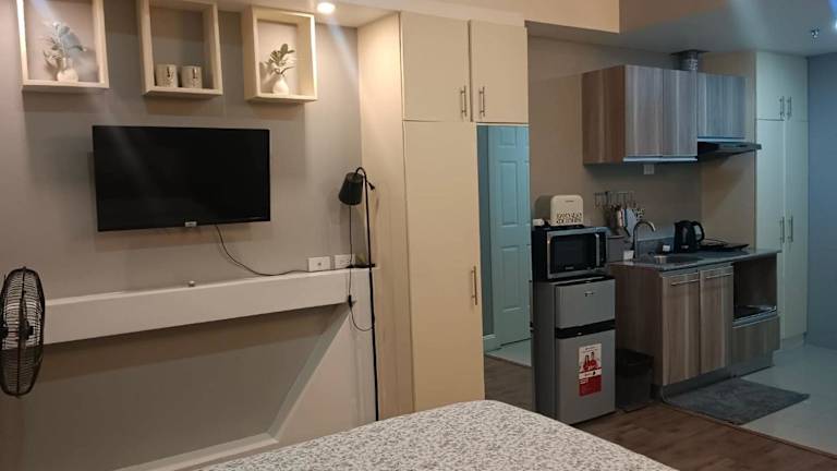 Das klimatisierte Apartment im Golf View, New Studio Apartment Grand Residences Cebu, North Tower A verfügt über ein gemütliches Schlafzimmer, eine voll ausgestattete Küchenzeile mit Kühlschrank und Mikrowelle sowie ein modernes Badezimmer. Ein Flachbild-TV sorgt für Unterhaltung.