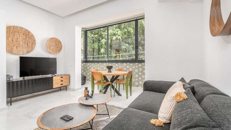 Das klimatisierte Apartment im Gordon area - Deluxe 2bdr bietet 2 Schlafzimmer, eine voll ausgestattete Küche, einen gemütlichen Sitzbereich und einen Flachbild-TV. Genießen Sie den Komfort und die Privatsphäre eines eigenen Apartments während Ihres Aufenthalts in Tel Aviv.
