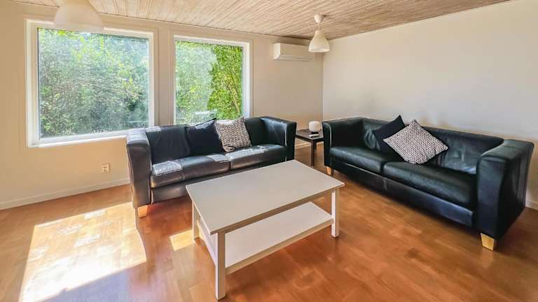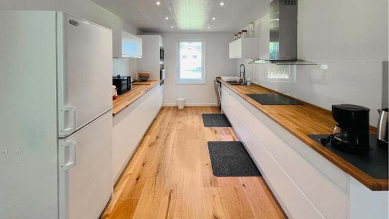 Die Zimmer umfassen zwei Schlafräume und ein Wohnzimmer sowie eine voll ausgestattete Küche mit Kühlschrank und Geschirrspüler.
